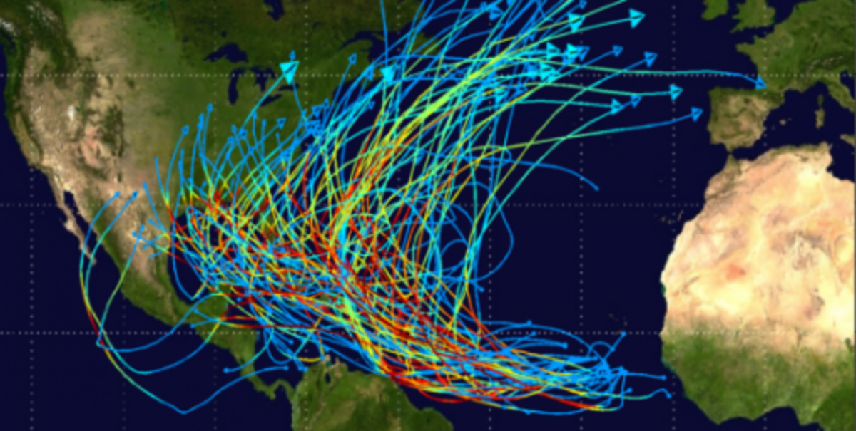 100 synthetic Atlantic hurricane tracks generated by a technique developed by our research group. Colors denote peak storm wind speed. We generate tens of thousands of such tracks for the current and future climates and use them to help assess hurricane risk - image: K. Emanuel